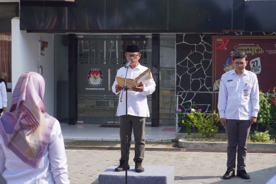 Bertindak sebagai pembina apel, Anggota KPU Kabupaten Pacitan Divisi Hukum dan Pengawasan, Iwit Widhi Santoso, menyampaikan apresiasi kepada seluruh peserta atas partisipasi dan semangat yang terus terjaga.