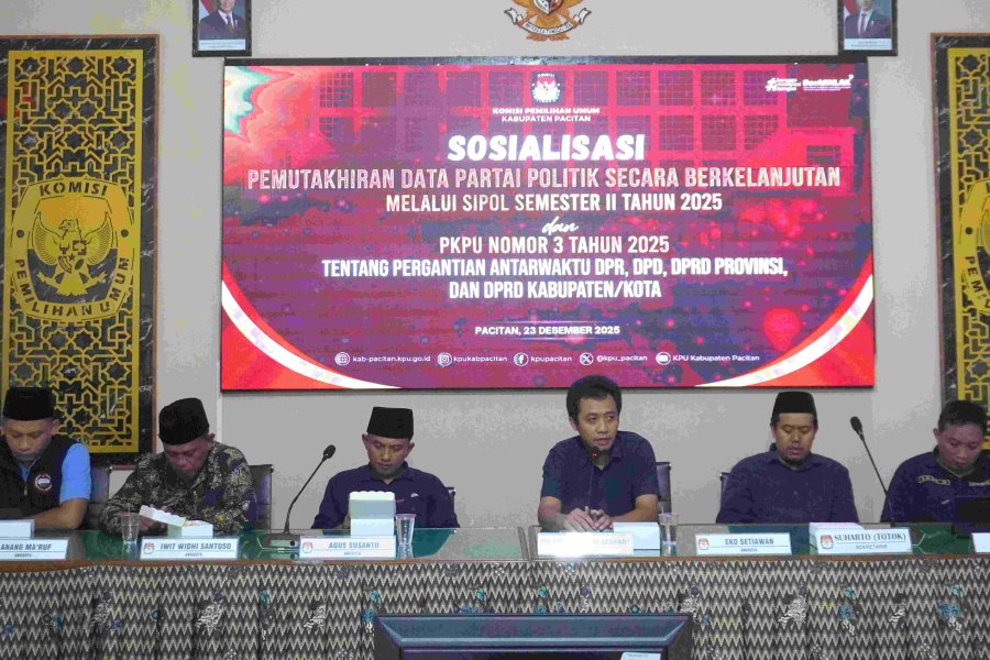 Pacitan, kab-pacitan.kpu.go.id – Guna memastikan keakuratan data partai politik serta pemahaman yang sama terkait mekanisme pergantian antarwaktu (PAW), sosialisasi pemutakhiran data partai politik secara berkelanjutan melalui Sistem Informasi Partai Politik (SiPol) Semester II Tahun 2025 dan Peraturan KPU (PKPU) Nomor 3 Tahun 2025 diselenggarakan oleh Komisi Pemilihan Umum (KPU) Kabupaten Pacitan. Kegiatan tersebut dilaksanakan pada Selasa (23/12/2025), bertempat di Rumah Pintar Pemilu (RPP) KPU Kabupaten Pacitan.