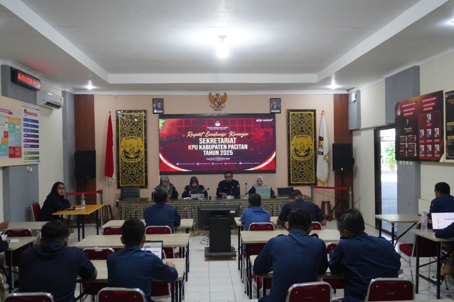 Pacitan, kab-pacitan.kpu.go.id – Evaluasi capaian kinerja Tahun Anggaran 2025 dan perumusan langkah strategis pengelolaan kesekretariatan menjadi fokus Rapat Evaluasi Kinerja Sekretariat Komisi Pemilihan Umum (KPU) Kabupaten Pacitan yang digelar Selasa (6/1/2025) di Rumah Pintar Pemilu (RPP) KPU Kabupaten Pacitan.