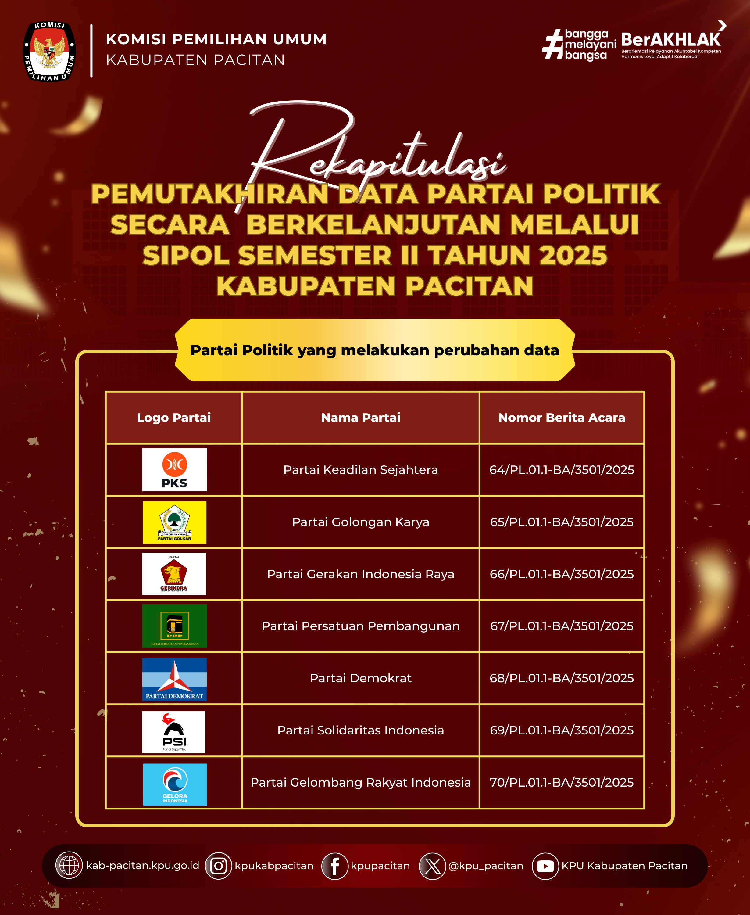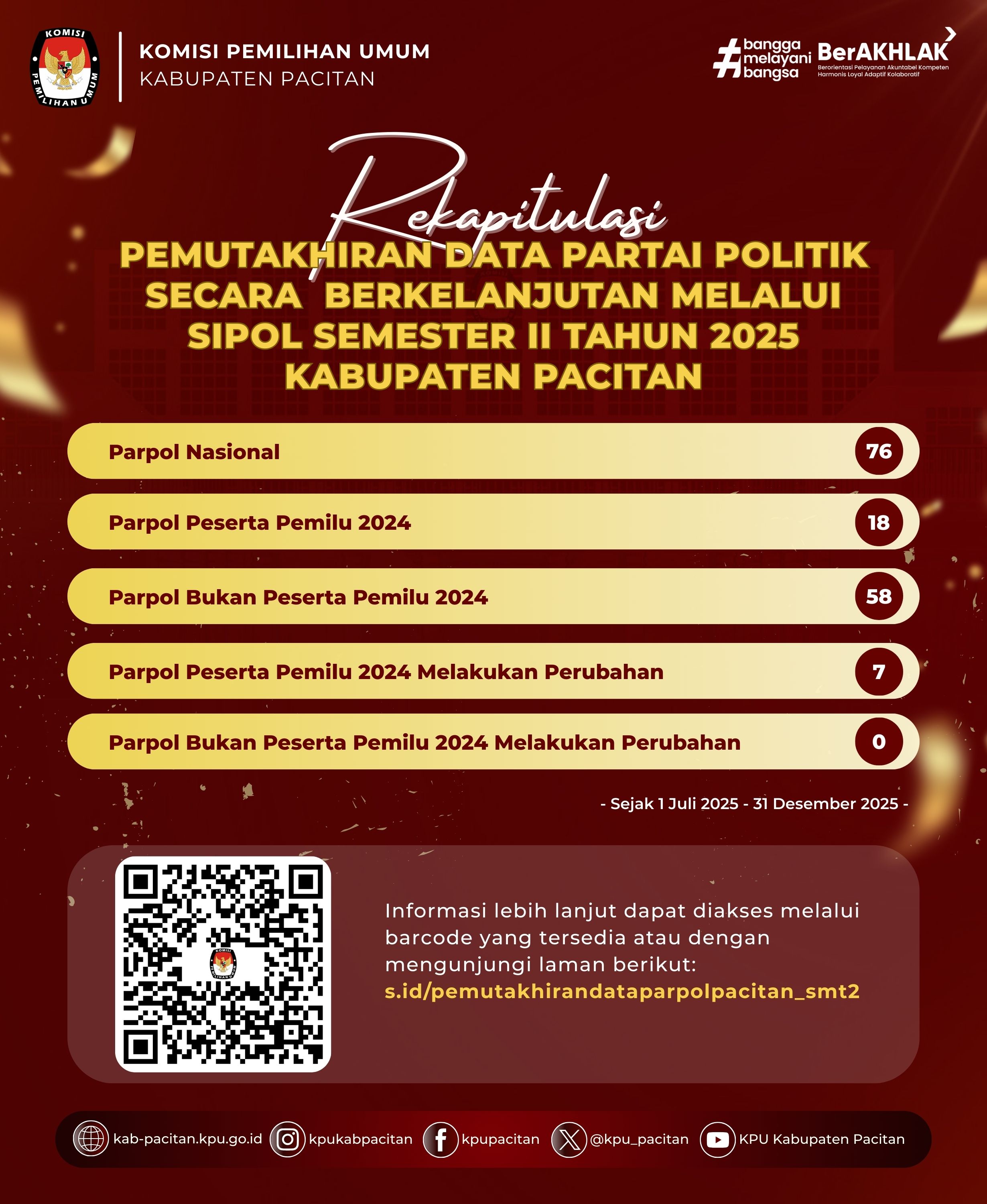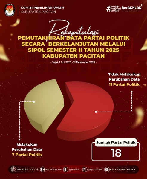 Pacitan, kab-pacitan.kpu.go.id — Komisi Pemilihan Umum Kabupaten Pacitan merilis infografis Rekapitulasi Pemutakhiran Data Partai Politik yang dilakukan secara berkelanjutan melalui Sistem Informasi Partai Politik (SIPOL) pada Semester II Tahun 2025.