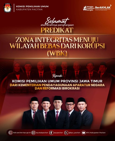 Pacitan, kab-pacitan.kpu.go.id — Komisi Pemilihan Umum (KPU) Kabupaten Pacitan menyampaikan ucapan selamat kepada KPU Provinsi Jawa Timur atas diraihnya penghargaan Predikat Zona Integritas Menuju Wilayah Bebas dari Korupsi (WBK) dari Kementerian Pendayagunaan Aparatur Negara dan Reformasi Birokrasi (KemenPAN-RB).