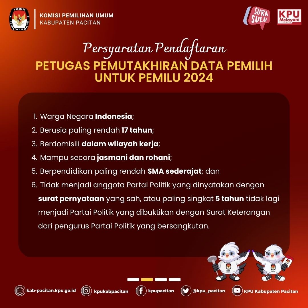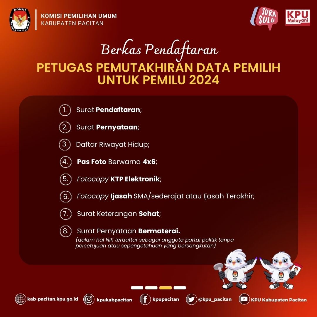 #TemanPemilih, berikut kami sampaikan syarat, berkas, dan jadwal pendaftaran Petugas Pemutakhiran Data Pemilih (Pantarlih).