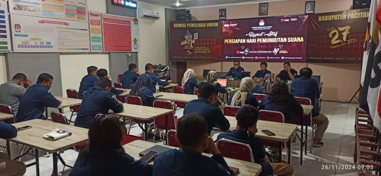 kab-pacitan.kpu.go.id - Pacitan - Dalam rangka persiapan pelaksanaan Pemungutan dan Penghitungan Suara pada Pemilihan Gubernur dan Wakil Gubernur, Bupati dan Wakil Bupati, serta Wali Kota dan Wakil Wali Kota Tahun 2024, Komisi Pemilihan Umum (KPU) Kabupaten Pacitan menggelar Rapat Staf Persiapan, Selasa (26/11/2024). Kegiatan tersebut berlangsung di Rumah Pintar Pemilu KPU Kabupaten Pacitan.