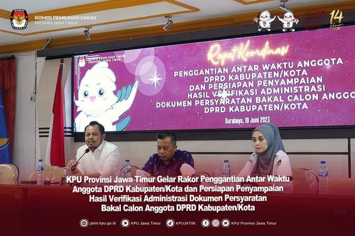 Surabaya, kab-pct.kpu.go.id - Komisi Pemilihan Umum Provinsi Jawa Timur (KPU Jatim) menggelar rapat koordinasi (rakor) bersama KPU Kabupaten/Kota pada Senin, 19 Juni 2023 di aula kantor KPU Jatim, Jalan Raya Tenggilis Nomor 1 - 3 Surabaya. Ini terkait akan memasuki tahapan penyampaian hasil verifikasi administrasi (vermin) dokumen persyaratan calon anggota Dewan Perwakilan Rakyat Daerah (DPRD),
