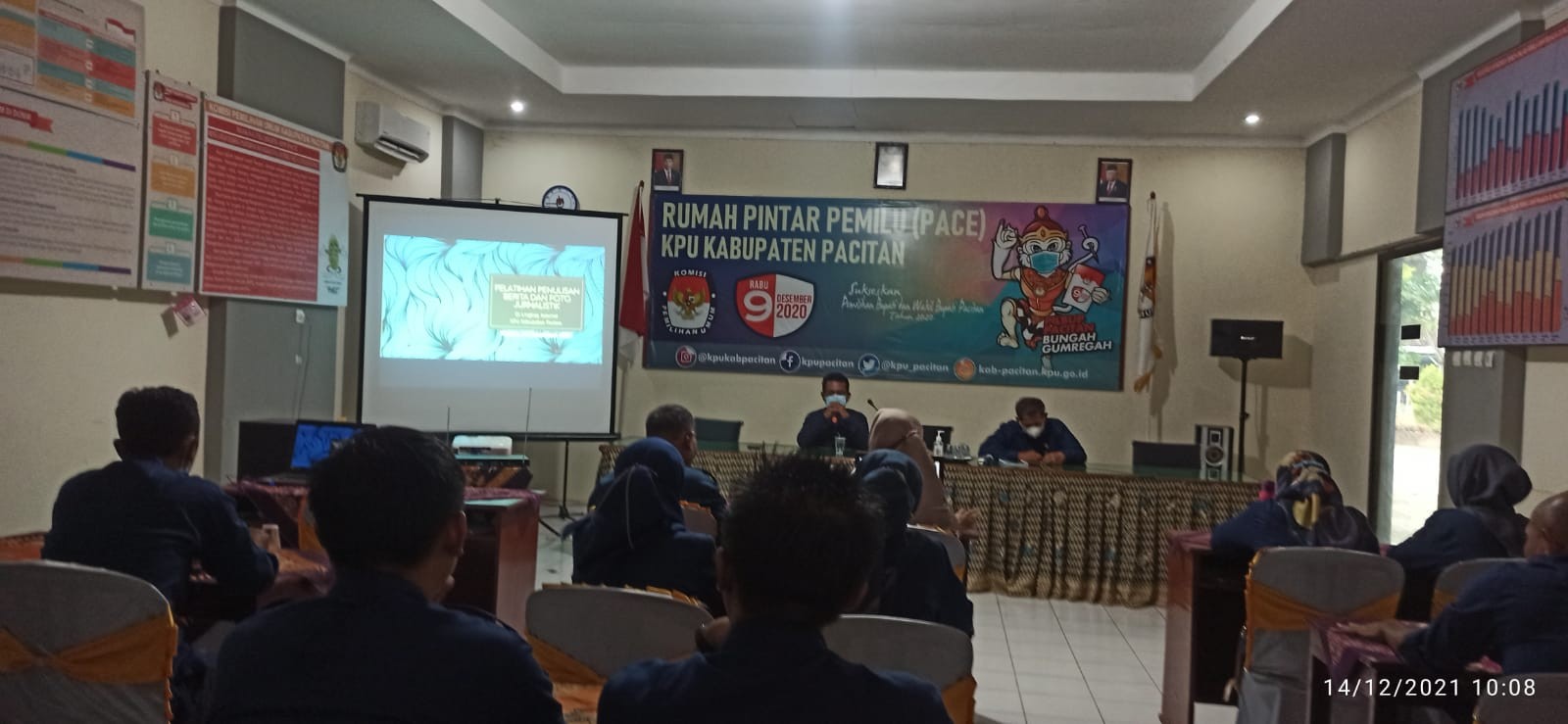 Komisi Pemilihan Umum (KPU) Kabupaten Pacitan mengadakan pelatihan menulis berita dan foto jurnalistik, Selasa (14/12/2020) di Rumah Pintar Pemilu (RPP) Pace. Pelatihan yang dimulai pukul 09.00 – 11.00 WIB diikuti seluruh pejabat dan staf sekretariat. “Menulis berita kegiatan di lingkup KPU sangat penting. Salah satunya sebagai wujud transparansi,” kata Sekretaris KPU Pacitan, Bambang Sutejo saat membuka acara pelatihan.
