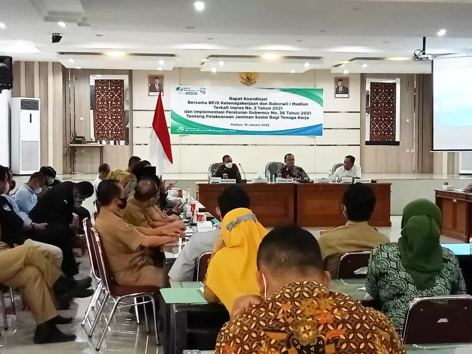 Kegiatan yang diikuti sejumlah dinas/instansi terkait di wilayah Madiun dan Kediri, membahas Impres No. 2/2021, sekaligus implementasi Peraturan Gubernur No. 36/2021 tentang pelaksanaan Jaminan Sosial bagi Tenaga Kerja.