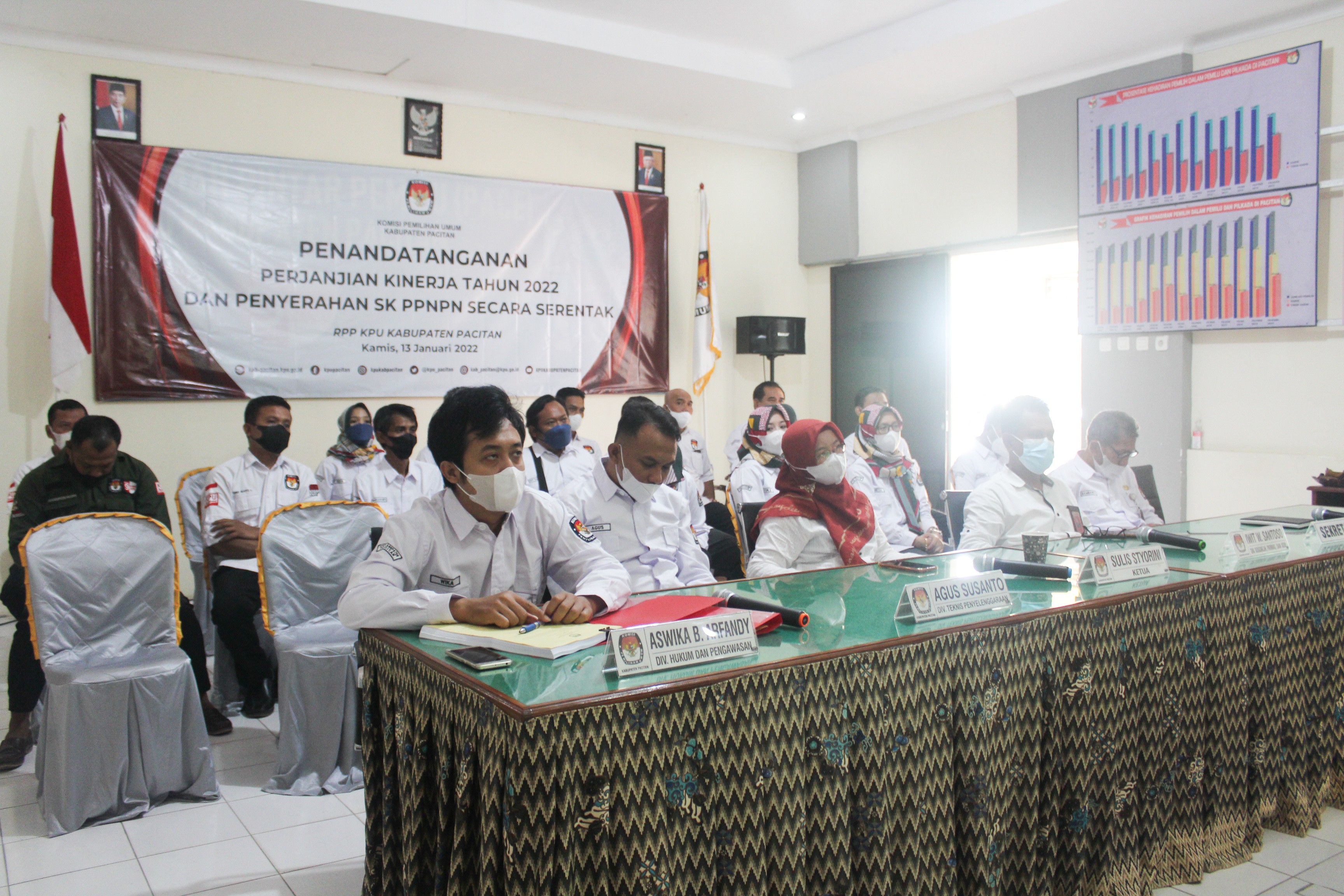 Sesuai dengan rundown, selesai sambutan ketua KPU Provinsi Jawa Timur, acara dilanjutkan penandatanganan perjanjian kinerja dimulai dari staf pelaksana baik PNS maupun Non PNS, kasubbag, sekretaris dan komisioner KPU Kabupaten Pacitan.