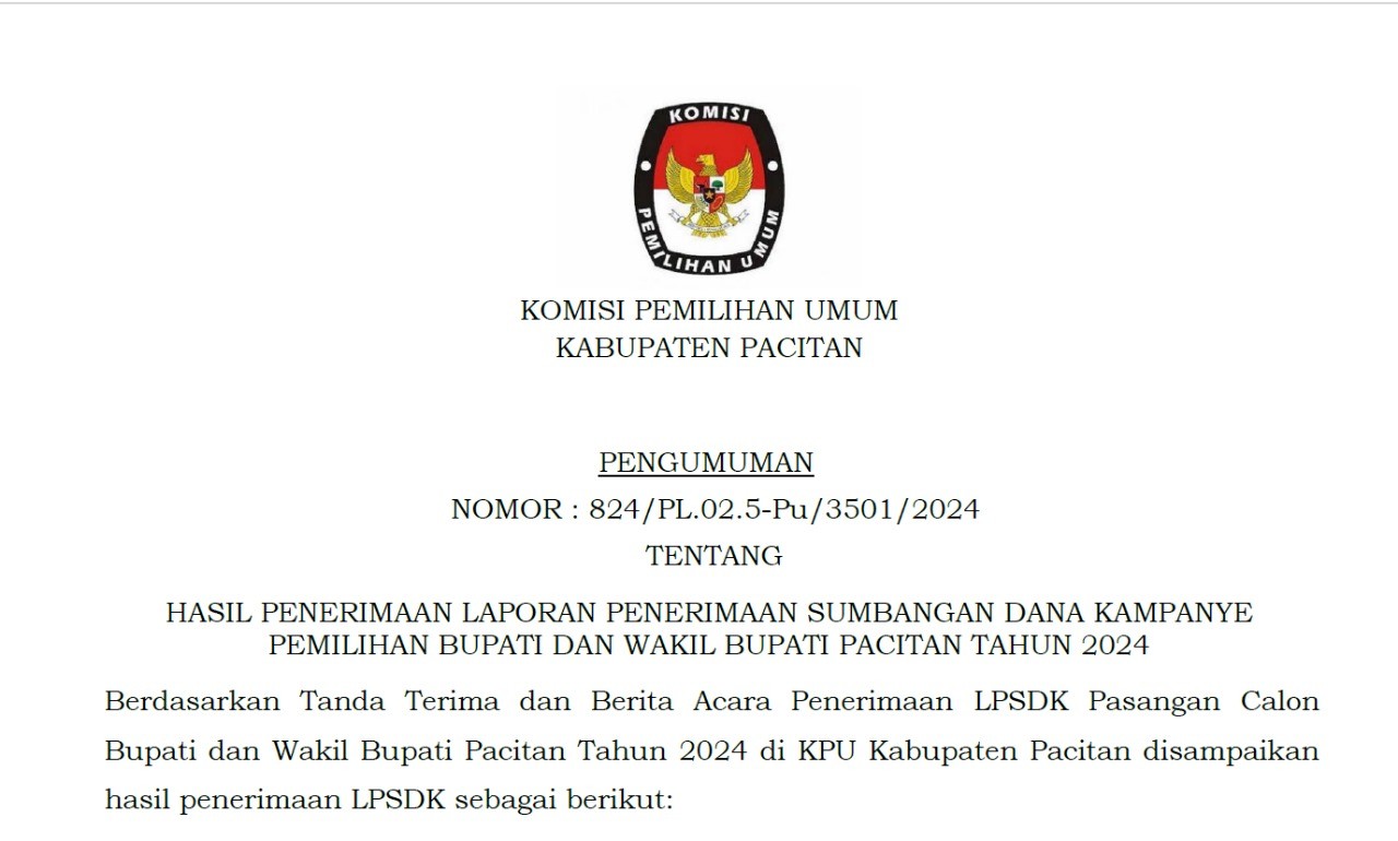PENGUMUMAN HASIL PENERIMAAN LAPORAN PENERIMAAN SUMBANGAN DANA KAMPANYE PEMILIHAN BUPATI DAN WAKIL BUPATI PACITAN TAHUN 2024