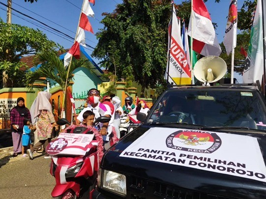 Pacitan, kab-pacitan.go.id – “Teman Pemilih Kecamatan Donorojo, jangan lupa 14 Februari 2024 kita datang ke TPS untuk memilih Presiden dan Wakil Presiden, Anggota DPR, DPD, DPRD Provinsi, dan DPRD Kabupaten. Pastikan nama anda terdaftar sebagai pemilih tetap dengan cek website kami cekdptonline.kpu.go.id,” terdengar dari pengeras suara sebuah mobil pick up yang merupakan salah satu peserta dalam kegiatan Panitia Peringatan Hari Besar Nasional (PPHBN) Kecamatan Donorojo yaitu sepeda hias pada Sabtu (19/02/2023).
