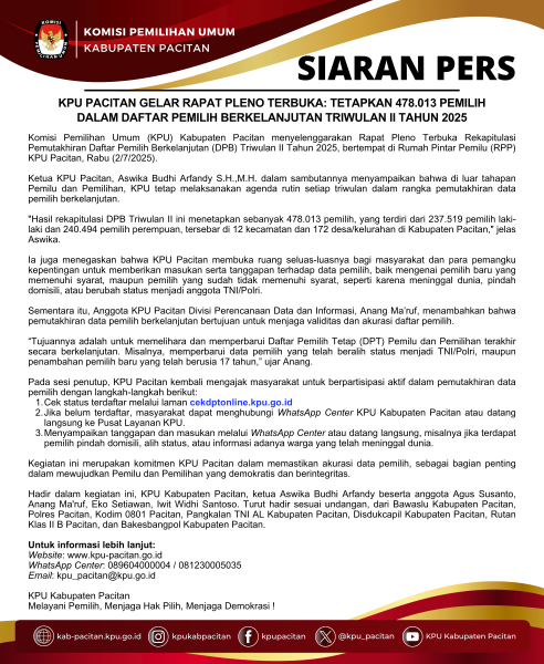 SIARAN PERS : KPU PACITAN GELAR RAPAT PLENO TERBUKA: TETAPKAN 478.013 PEMILIH DALAM DAFTAR PEMILIH BERKELANJUTAN TRIWULAN II TAHUN 2025