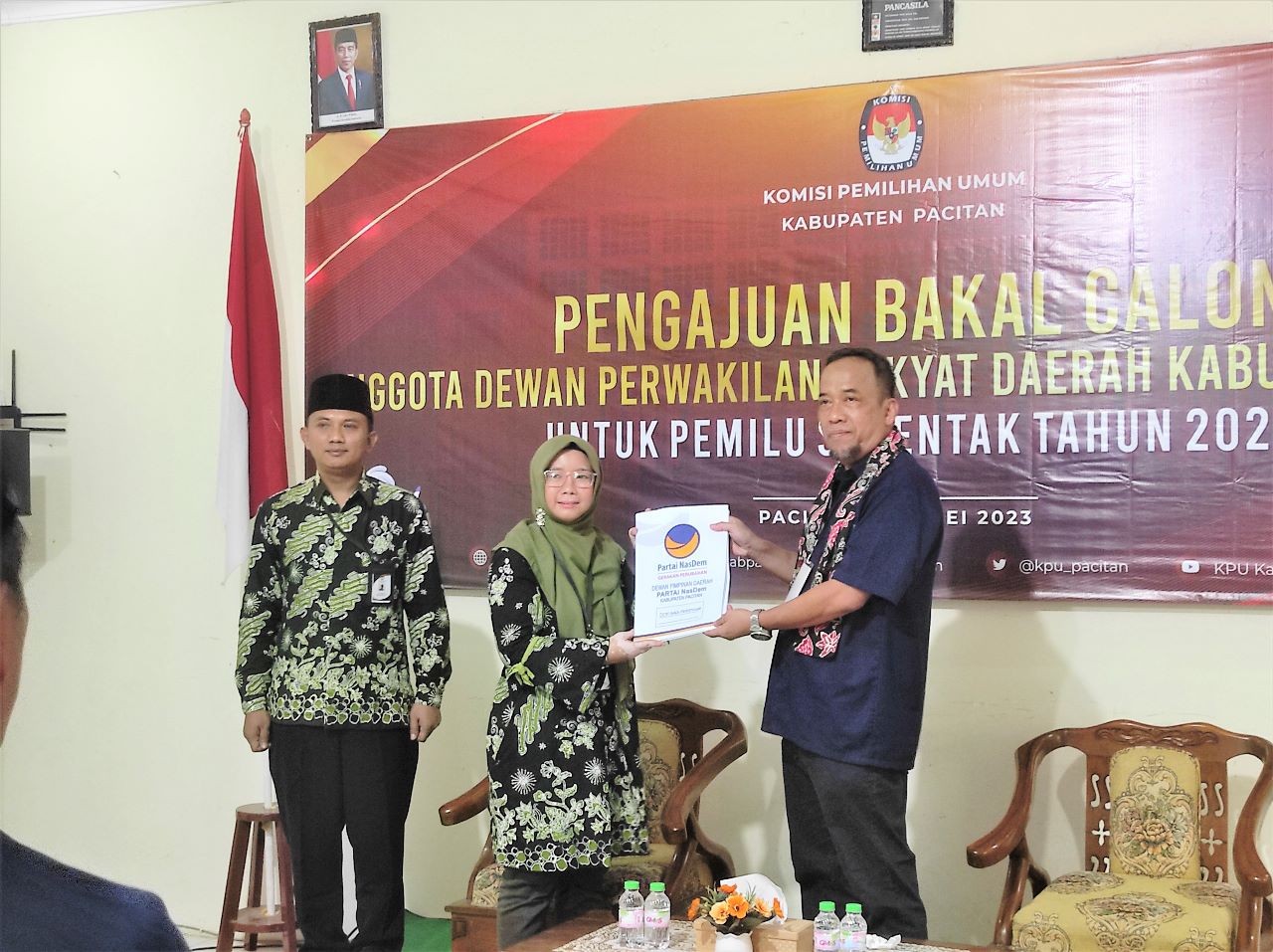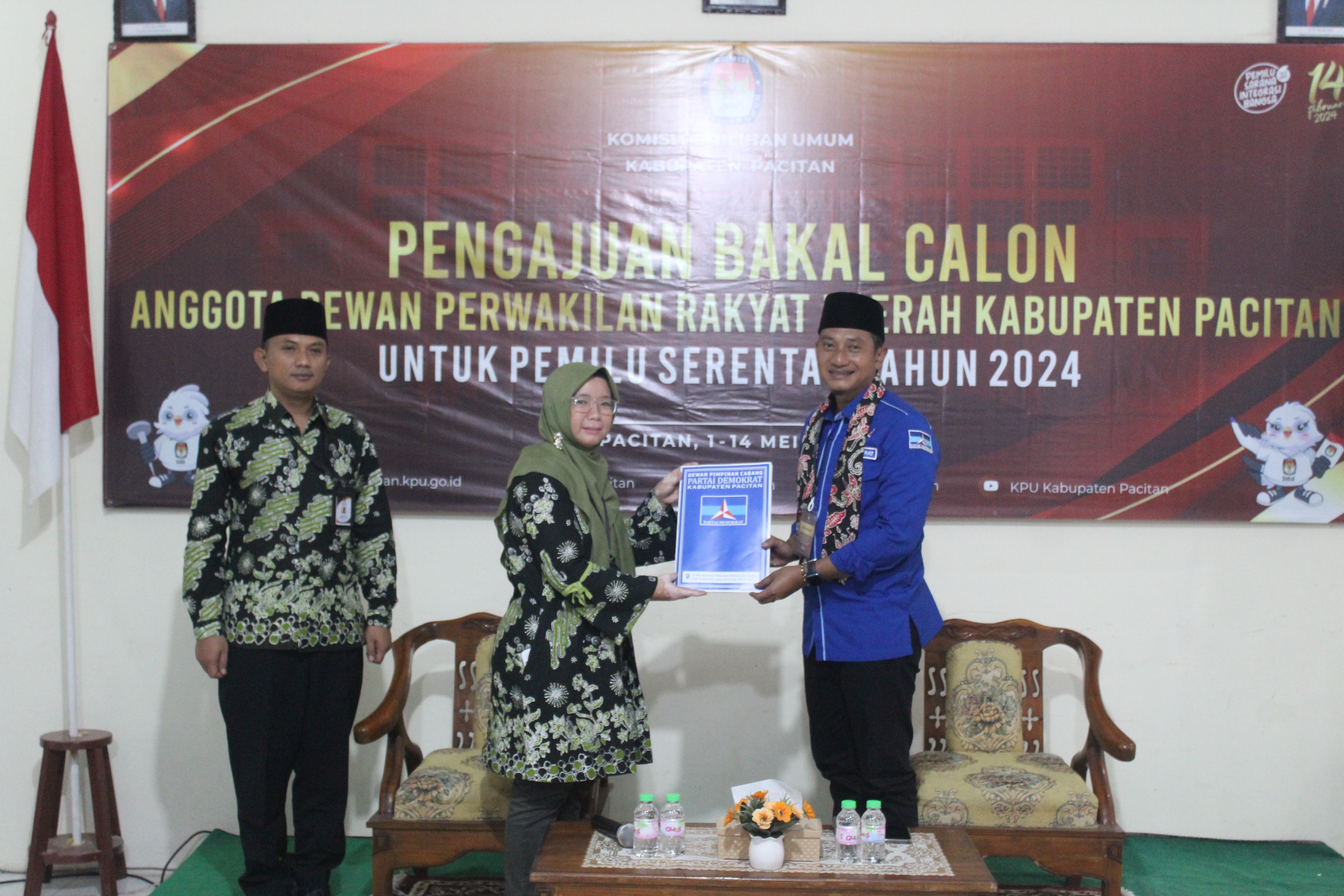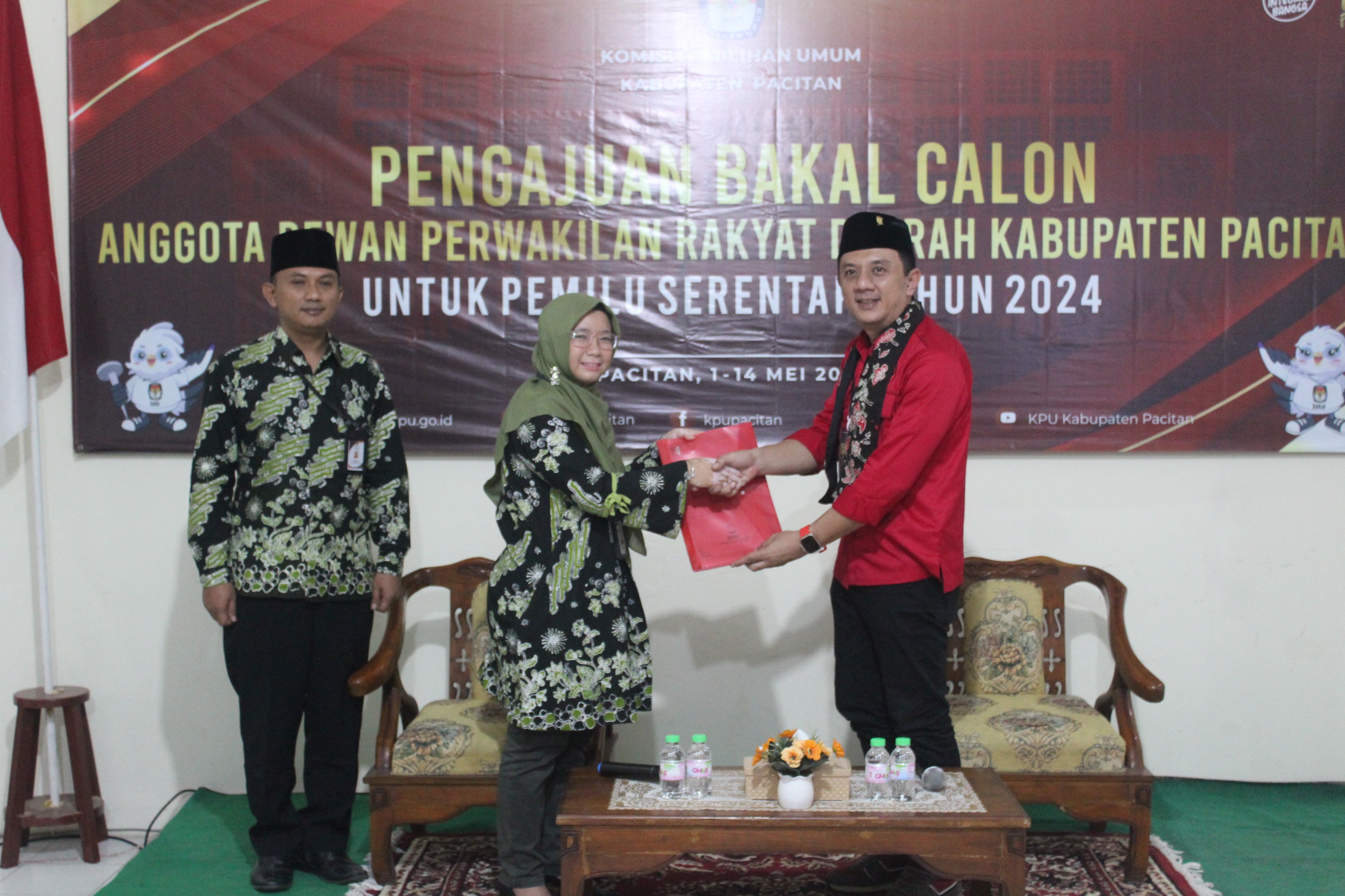 Pacitan, kab-pacitan.kpu.go.id – Partai Kebangkitan Bangsa (PKB) Kabupaten Pacitan mendaftarkan bakal calon (bacalon) anggota DPRD ke KPU Kabupaten Pacitan, Jl. Veteran 66, Sabtu (13/5/2023). Setelah mengisi daftar hadir dilanjutkan seremonial penyambutan berupa pengalungan selendang dan id card, oleh Sekretaris KPU Pacitan, Bambang Sutejo. Selanjutnya, rombongan PKB dipersilakan masuk ke ruang Rumah Pintar Pemilu (RPP) KPU Pacitan untuk prosesi penyerahan dokumen persyaratan pengajuan bacalon. Ketua DPC PKB Kabupaten Pacitan, Fibi Irawan, dalam sambutannya mengatakan kedatangannya ke kantor KPU Pacitan adalah menyampaikan pengajuan bacalon Anggota DPRD Kabupaten Pacitan untuk Pemilu 2024. “Kami daftarkan bacalon Anggota DPRD, sesuai peraturan perundang-undangan. Terima kasih atas sambutan dari KPU Pacitan,” kata Fibi Irawan. Sementara, Ketua KPU Pacitan, Sulis Styorini, menandaskan, sesuai jadwal, pengajuan bakal calon DPRD Kabupaten Pacitan untuk Pemilu 2024, mulai tanggal 1 - 14 Mei 2023. Adapun berkas dokumen kelengkapan administrasi, berupa formulir model B pengajuan parpol dan formulir Model B-DAFTAR.BAKAL.CALON-PARPOL disertai foto diri terbaru diserahkan dalam bentuk fisik dan bentuk digital pada Sistem Informasi Pencalonan (Silon). “Dokumen persyaratan administrasi bacalon, sebagaimana dimaksud dalam pasal 12- 23 PKPU Nomor 10 Tahun 2023, tentang Pencalonan Anggota DPR, DPRD Propinsi dan DPRD Kabupaten/Kota dalam bentuk digital yang diunggah di Silon,” jelas Ketua KPU Pacitan. Prosesi selanjutnya, Fibi Irawan menyerahkan dokumen bacalon kepada Ketua KPU Pacitan, yang secara estafet diteruskan menyerahkan dokumen persyaratan bacalon ke Divisi Teknis Penyelenggaraan KPU Pacitan, Agus Susanto, hingga diteliti Tim Verifikator untuk dilakukan pengecekkan seluruh dokumen. “Jika dokumen persyaratan administrasi bacalon dalam bentuk digital yang terdapat di silon, dinyatakan lengkap dan benar, KPU Pacitan memberi tanda terima. Sebaliknya, jika dokumen syarat pengajuan bacalon tidak lengkap, tidak memenuhi persyaratan dan atau tidak benar, maka pengajuan akan dikembalikan,” jelas Agus Susanto. Perlu diketahui, pengajuan bakal calon yang statusnya dinyatakan diterima, akan dilakukan verifikasi administrasi dokumen persyaratan bacalon mulai 15 Mei 2023 sampai dengan 23 Juni 2023. Selesai menyerahkan berkas dokumen pengajuan bacalon Anggota DPRD Kabupaten Pacitan, Ketua DPC PKB Pacitan, Fibi Irawan, menyampaikan konferensi pers kepada awak media. (Tim Bakohumas KPU Pacitan)
