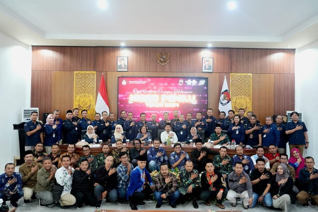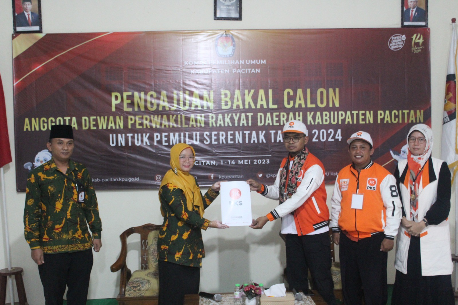 Pacitan, kab-pacitan.kpu.go.id – Partai Keadilan Sejahtera (PKS) mendaftarkan bakal calon (bacalon) anggota DPRD ke KPU Kabupaten Pacitan, Jl. Veteran 66, Senin (8/5/2023). Setelah mengisi daftar hadir dilanjutkan seremonial penyambutan berupa pengalungan selendang dan id card, oleh Sekretaris KPU Pacitan, Bambang Sutejo. Selanjutnya, rombongan PKS dipersilakan masuk ke ruang Rumah Pintar Pemilu (RPP) KPU Pacitan untuk prosesi penyerahan dokumen persyaratan pengajuan bacalon. Ketua DPD PKS Kabupaten Pacitan, Ahmad Rifai mengatakan pengajuan bacalon Anggota DPRD Kabupaten Pacitan untuk Pemilu 2024 sudah sesuai regulasi dari KPU. “Proses pemberkasan lancar, sesuai regulasi dan berkas sudah siap untuk diserahkan ke KPU Pacitan,” kata Ketua DPD PKS sesaat sebelum menyerahkan dokumen kepada Ketua KPU Pacitan. Sementara, Ketua KPU Pacitan, Sulis Styorini, menandaskan, sesuai jadwal, pengajuan bakal calon DPRD Kabupaten Pacitan untuk Pemilu 2024, mulai tanggal 1 - 14 Mei 2023. Adapun berkas dokumen kelengkapan administrasi, berupa formulir model B pengajuan parpol dan formulir Model B-DAFTAR.BAKAL.CALON-PARPOL disertai foto diri terbaru diserahkan dalam bentuk fisik dan bentuk digital pada Sistem Informasi Pencalonan (Silon). “Selanjutnya, dokumen persyaratan administrasi bacalon, sebagaimana dimaksud dalam pasal 12- 23 PKPU Nomor 10 Tahun 2023, tentang Pencalonan Anggota DPR, DPRD Propinsi dan DPRD Kabupaten/Kota dalam bentuk digital yang diunggah di Silon,” jelas Ketua KPU Pacitan. Berikutnya, Ketua KPU Pacitan, menyerahkan dokumen persyaratan ke Divisi Teknis Penyelenggaraan KPU Pacitan, Agus Susanto, kemudian diteruskan ke Tim Verifikator untuk dilakukan pengecekkan seluruh dokumen. “Jika dokumen persyaratan administrasi bacalon dalam bentuk digital yang terdapat di silon,dinyatakan lengkap dan benar, KPU Pacitan memberi tanda terima. Sebaliknya, jika dokumen syarat pengajuan bacalon tidak lengkap, tidak memenuhi persyaratan dan atau tidak benar, maka pengajuan akan dikembalikan dengan memberi tanda pengembalian,” jelas Agus Susanto. Perlu diketahui, pengajuan bakal calon yang statusnya dinyatakan diterima, akan dilakukan verifikasi administrasi dokumen persyaratan bacalon mulai 15 Mei 2023 sampai dengan 23 Juni 2023. Selesai menyerahkan berkas dokumen pengajuan bacalon Anggota DPRD Kabupaten Pacitan, Ketua DPD PKS, Ahmad Rifai, menyampaikan konferensi pers kepada awak media. (Tim Bakohumas KPU Pacitan)