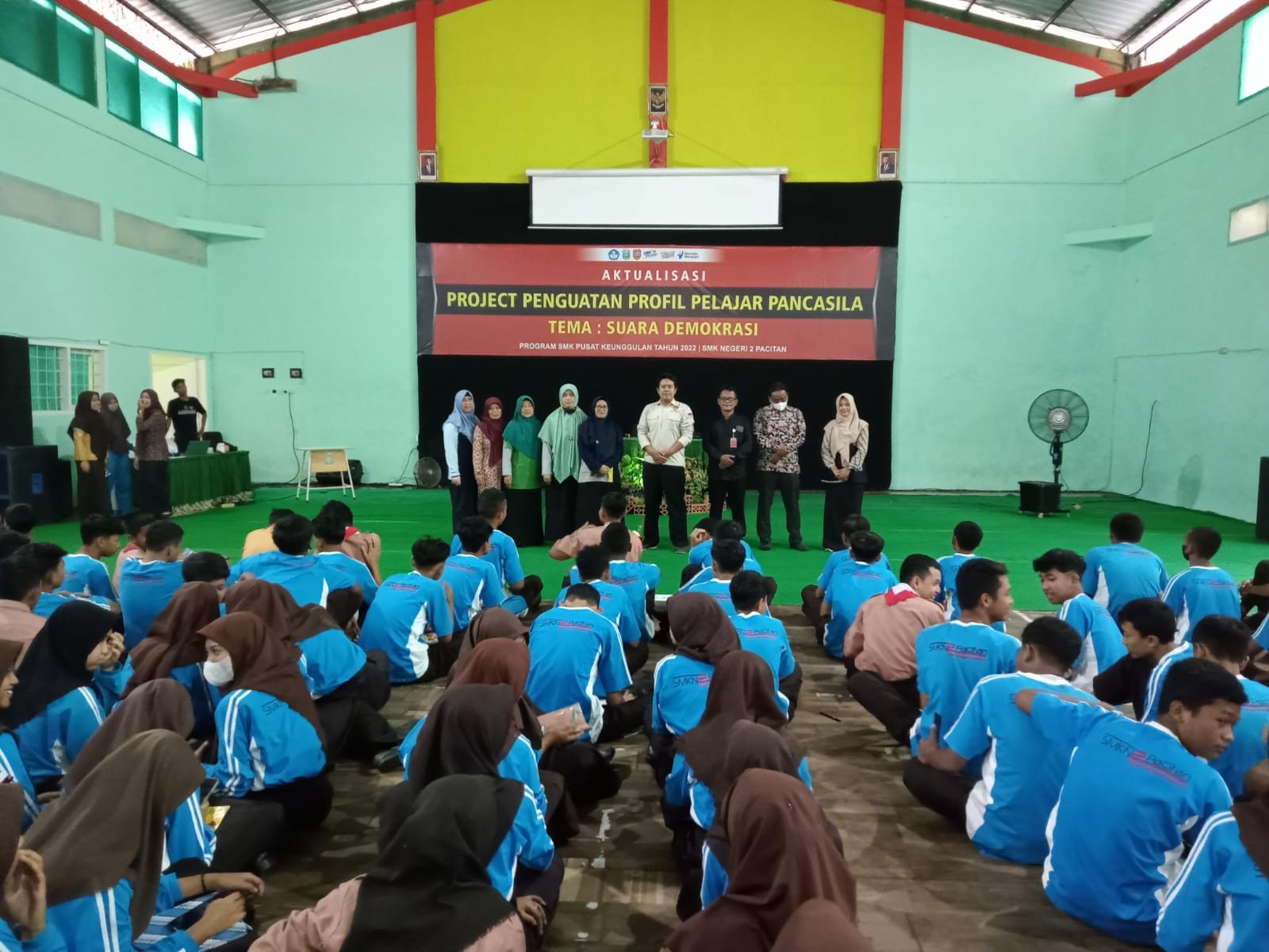 Pacitan, kab-pacitan.kpu.go.id – Sekolah Menengah Kejuruan Negeri (SMKN) 2 Pacitan, menggelar aktualisasi Proyek Penguatan Profil Pelajar Pancasila (P5) dengan tema 'Suara Demokrasi', di aula SMKN 2, Jumat (14/10/2022). Kegiatan yang dimulai pukul 08.00 WIB diikuti 300 siswa-siswi kelas 10 SMKN 2 Pacitan.