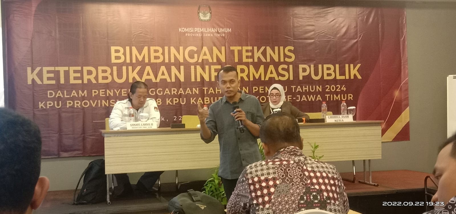 Gresik, kab-pacitan.kpu.go.id - Edi Purwanto, Komisioner Komisi Informasi (KI) Propinsi Jawa Timur menegaskan badan publik harus memberikan informasi kepada publik. Hal itu tertuang dalam Undang-Undang Nomor 14 Tahun 2008 tentang Keterbukaan Informasi Publik. “Prinsipnya semua warga berhak mendapat informasi dan badan publik berkewajiban menyampaikan seluruh informasi yang dimohonkan kecuali informasi yang dikecualikan,” kata Edi Purwanto, saat meyampaikan materi dalam Acara Bimbingan Teknis Keterbukaan Informasi Publik dalam Penyelenggaraan Tahapan Pemilu Tahun 2024, di Gresik, Jumat (23/9/2022). Lebih lanjut, Komisioner Bidang Advokasi, Sosialisasi, dan Edukasi KI ini, badan publik, termasuk KPU, harus menyediakan informasi yang bisa diakses masyarakat. Baik melalui laman resminya, website maupun media sosial.Tidak itu saja, badan publik juga berkomitmen untuk melayani permohonan informasi sesuai Standar Operasional Prosedur (SOP). “Informasi yang dimaksud adalah informasi yang dimiliki KPU. Misalnya, tentang tahapan, program dan jadwal Pemilu 2024, peraturan perundang-undangan, dll”. Dalam kesempatan itu, Edi Purwanto juga menguraikan mengenai alu informasi publik. Mulai penyusunan daftar informasi publik (DIP), pengklasifikasian anatara informasi serta merta, berkala, setiap saat maupun yang dikecualikan. “Paling tidak, up date informasi dilakukan setiap enam bulan sekali,” katanya. (Tim Bakohumas KPU Pacitan)