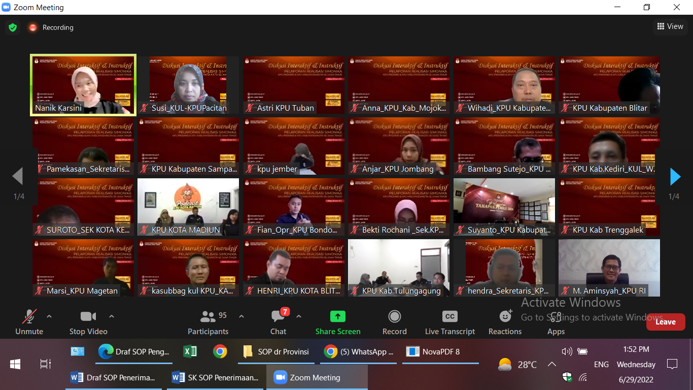 Pacitan, kab-pacitan.kpu.go.id – KPU Kabupaten Pacitan mengikuti Diskusi Interaktif dan Instruktif Pelaporan Realisasi Simonika yang diselenggarakan oleh KPU Provinsi Jawa Timur, Rabu (29/06/2022). Kegiatan tersebut bertujuan memberikan pemahaman yang sama terkait Aplikasi Online Simonika di 38 KPU Kabupaten/Kota di lingkup KPU Provinsi Jawa Timur. Kegiatan tersebut menghadirkan pemateri IPK Biro Keuangan KPU RI, Fidiar Fahudin. Dikatakan, berdasar Surat Sekjen KPU No. 753 Tahun 2021 dalam Aplikasi Simonika sebagai acuannya sumber data adalah dari Surat Perintah Pembayaran (SPP). " Sebelum ada SAKTI dahulu menggunakan realisasi aplikasi SAS sebagai sumber datanya,” jelasnya “Di Tahun 2021 dahulu kita masih menggunakan Aplikasi offline SAS. Setiap ada transaksi sudah bisa kita input. Nah, sedangkan sekarang sudah menggunakan aplikasi SAKTI, yang jadi acuan adalah di Modul Pembayaran yaitu SPP. Setelah SPP diajukan pada bulan berkenaan, rincian kegiatan, akun, mata anggaran, itulah data yang nantinya akan diinput di Aplikasi Simonika,” tambahnya. Setelah pemaparan materi, arahan dari Sekretaris KPU Provinsi Jatim, Nanik Karsini yang menyampaikan, setelah mengikuti diskusi interaktif dan instruktif pelaporan realisasi Simonika ini bisa mengetahui dimana letak kekurangan, kesalahan dalam pelaporan dan bisa berbenah diri terkait pelaporan simonika ini. Hadir dalam giat tersebut, Sekretaris KPU Kabupaten Pacitan, Kasubbag KUL, Bendahara dan Operator Simonika, yang memanfaatkan kesempatan baik ini untuk memperbaiki, untuk belajar, sehingga bulan depan sudah bagus hasilnya. (Tim Bakohumas KPU Pacitan)