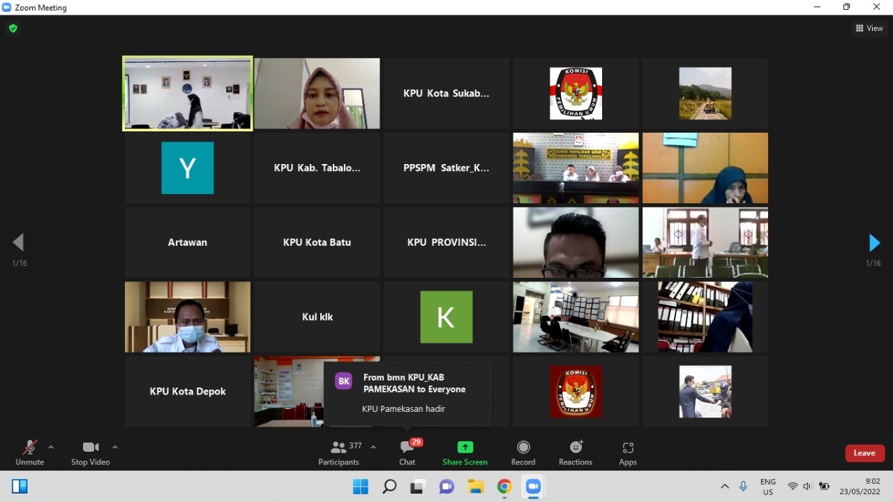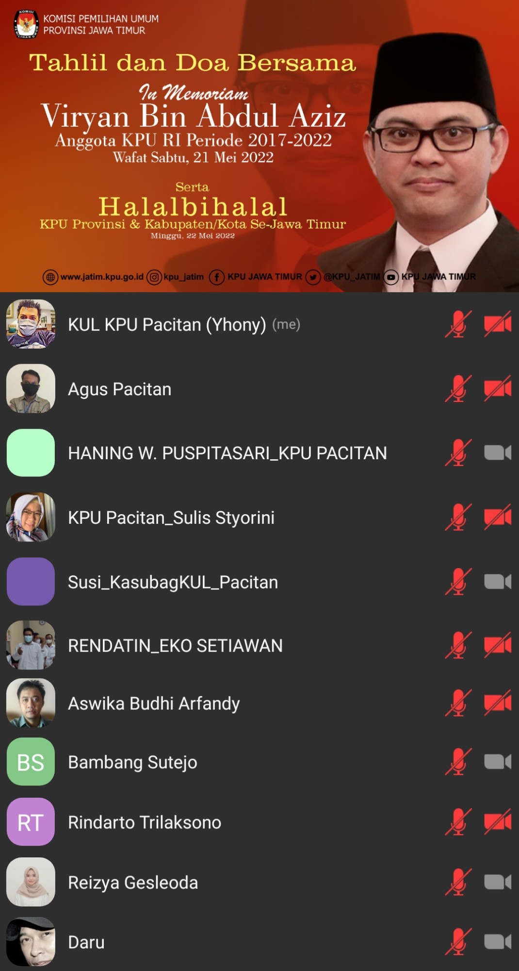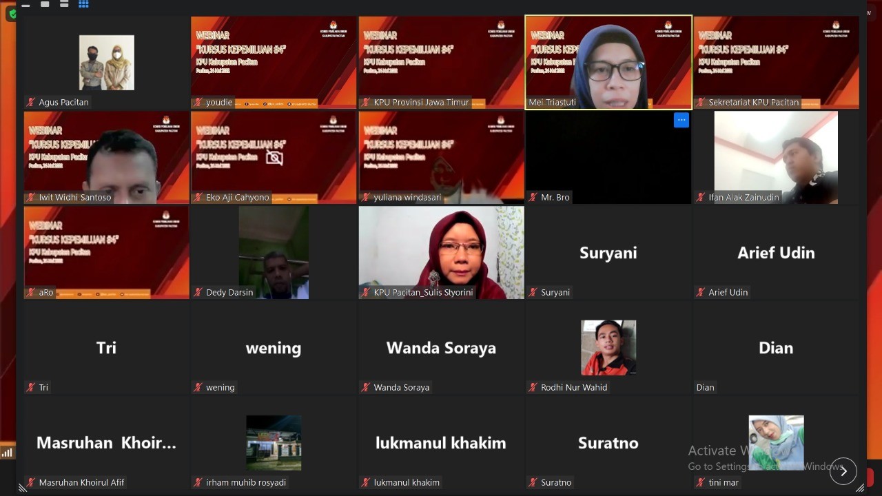 Pacitan, kab-pacitan.kpu.go.id – Komisi Pemilihan Umum Pacitan, kembali melaksanakan kursus kepemiluan seri ke empat melalui media dalam jaringan (daring), Selasa (24/5/2022). Kegiatan tersebut diikuti oleh 110 peserta yang berasal dari unsur mahasiswa, organisasi dan masyarakat umum. Tujuan kegiatan ini adalah untuk meningkatkan pemahaman, pengetahuan serta partisipasi tentang kepemiluan dan demokrasi. Kursus kepemiluan yang dilaksanakan hari ini, dibuka oleh Ketua kpu Kabupaten Pacitan, Sulis Styorini. Dalam sambutannya, Sulis Styorini berharap para peserta kursus kepemiluan mulai dari seri 1 sampai dengan seri ke 4 ini memperoleh manfaat, terutama terkait pengetahuan tentang pemilu dan demokrasi. Kemudian kegiatan dilanjutkan dengan pemaparan materi dari masing- masing narasumber. Diantaranya, Agus Susanto dengan materi Pendaftaran Parpol & Verifikasi. Berikutnya Iwit Widhi Santoso dengan materi Pembentukan Badan Adhoc, Sulis Styorini dengan materi Logistik Pemilu dan Aswika Budhi Arfandy dengan materi Pelanggaran Pemilu Selesesai pemaparan materi dilanjutkan sesi tanya jawab. Dalam sesi ini peserta sangat antusias. Diantaranya mengenai kejelasan periodisasi badan adhoc, logistik maupun hal-hal terkait kepemiluan. Kursus kepemiluan keempat ditutup dengan kuis seputar kepemiluan dan 5 orang pemenang berhasil mendapatkan doorprize. (Tim Bakohumas KPU Pacitan)