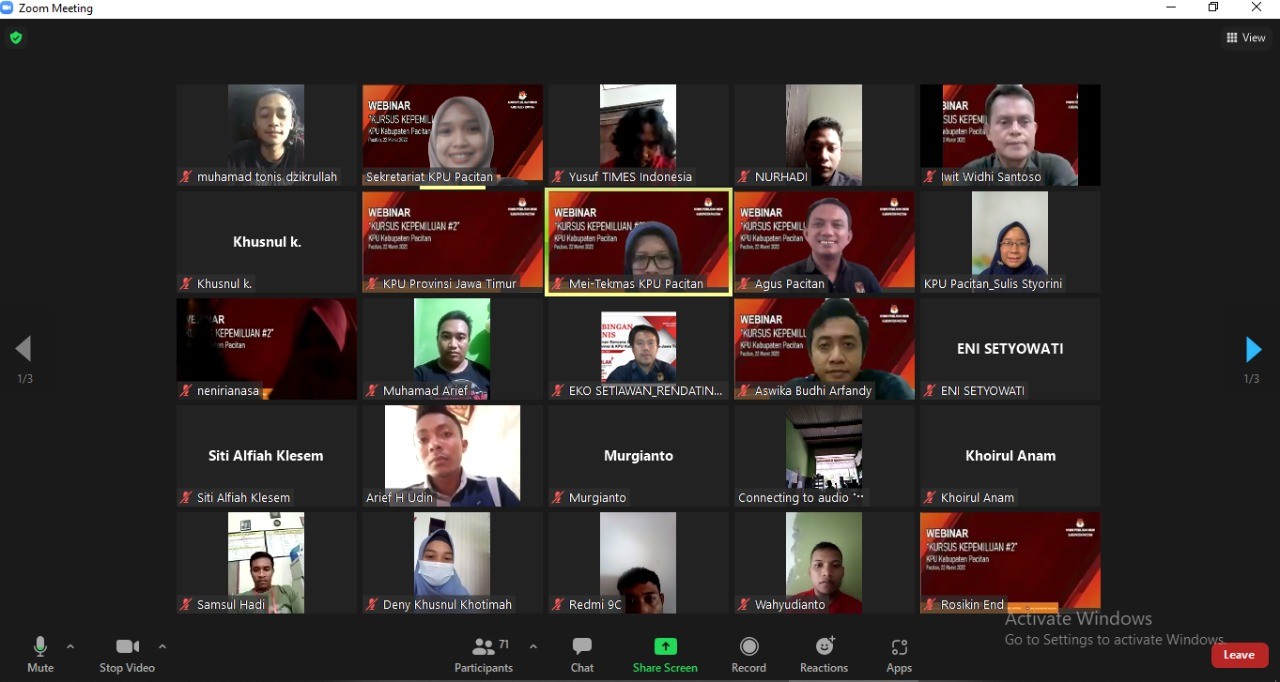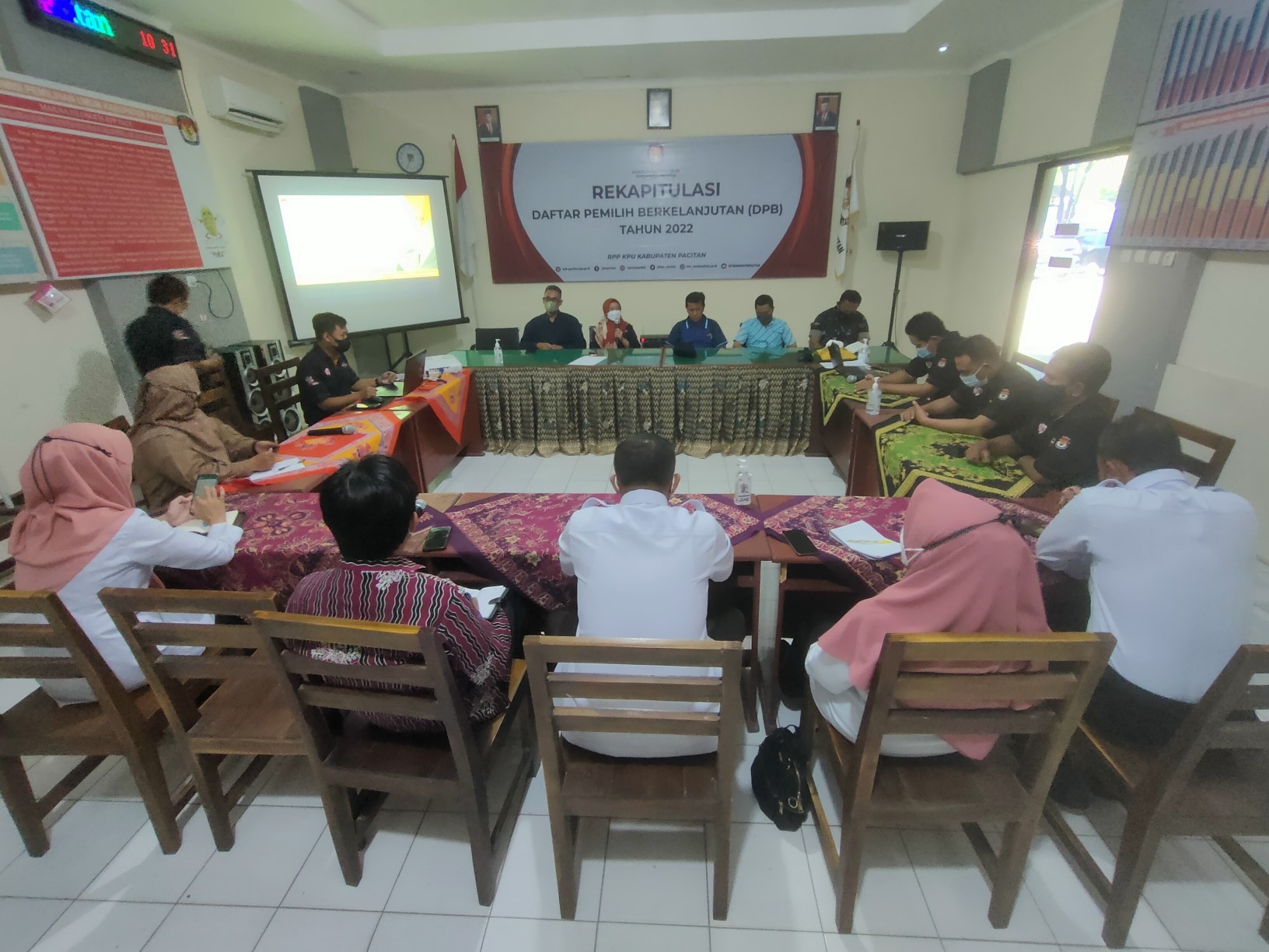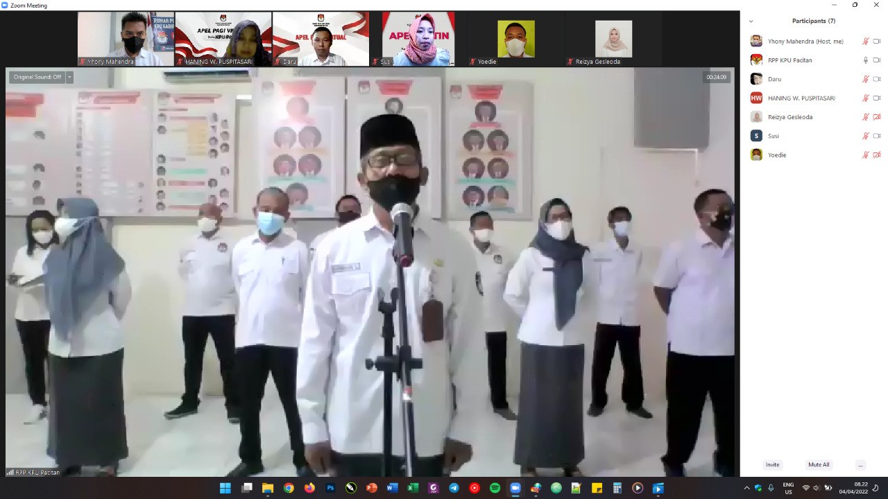 Pacitan, kab-pacitan.kpu.go.id – Komisi Pemilihan Umum (KPU) Pacitan melaksanakan apel pagi, Senin (4/4/2022). Kegiatan yang rutin dilakukan setiap hari Senin di Rumah Pinyar Pemilu (RPP) Pace, diikuti semua pegawai, baik secara luring maupun daring. Pelaksanaan apel pagi bagi pegawai KPU Pacitan, merupakan persiapan dalam mengawali tugas meski dilaksanakan awal bulan puasa. Hal tersebut tidak menyusutkan semangat pegawai untuk mengikuti apel pagi. Dalem kegiatan apel pagi Senin itu yang bertindak sebagai Pembina apel Sekretaris KPU Kabupaten Pacitan, Bambang Sutejo. Dikatakan, seluruh pegawai jangan dijadikan alasan menghadapi dan menjalankan ibadah puasa ramadhan itu dalam pelaksanaan tugas dan juga jangan menganggap sekedar menggugurkan kewajiban. Karena setiap orang yang menjalankan ibadah puasa itu akan diberikan pahala berlipat ganda oleh Allah SWT. Kemudian mengenai jam kerja sehari - hari selama bulan ramadhan ini, kita mengikuti aturan dari KPU Republik Indonesia berupa Surat Edaran Nomor 8 Tahun 2022 tentang Jam kerja Pegawai Pada Bulan Ramadhan 1443 Hijriah. Terakhir beliau menyampaikan selamat menunaikan ibadah Puasa 1443 H, serta meningkatkan disiplin, baik dalam kehadiran maupun dalam bekerja. (Tim Bakohumas KPU Pacitan)