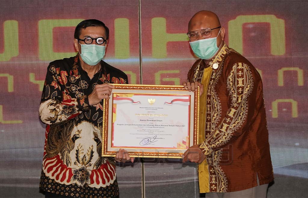 Jakarta, kpu.go.id – Prestasi membanggakan kembali ditorehkan Komisi Pemilihan Umum (KPU) RI di Tahun 2021 dengan kembali meraih predikat Terbaik 1 Jaringan Dokumentasi dan Informasi Hukum Nasional (JDIHN), dari Kementerian Hukum dan Ham (Kemenkumham), Kamis (2/12/2021). Penghargaan yang juga diraih pada 2019 dan 2020 ini menurut Ketua KPU RI, Ilham Saputra sebagai penegasan komitmen lembaganya menyediakan informasi hukum bagi masyarakat. “Kami mengapresiasi penghargaan ini dan akan mengonsolidasi kembali apa yang sudah kita lakukan terhadap anggota JDIHN apa yang sudah kita lakukan dan ingin kita lakukan setahun ke depan,” kata Ilham seusai menerima penghargaan Terbaik 1 JDIHN yang diserahkan Menteri Hukum dan Ham Yasonna H Laoly. Ilham pun menyadari masifnya perkembangan teknologi perlu disikapi dengan layanan informasi yang mudah dan cepat bagi masyarakat. Dan perubahan serta inovasi informasi hukum perlu dilakukan. “Masyarakat tentu harus bisa mengakses produk hukum kita, KPU, kepada pemilih, partai, masyarakat untuk transparansi, untuk memahami bagaimana pemilu itu bekerja dan bagaimana KPU menyelenggarakan tahapan-tahapan kepemiluan,” tambah Ilham. Sementara itu pada sambutannya, Yasonna H Laoly menyampaikan terima kasih kepada para anggota JDIHN atas sinergitas dalam mewujudkan penataan regulasi yang berkelanjutan untuk melanjutkan reformasi hukum sekaligus berinovasi mengembangkan pelayanan publik dibidang hukum secara berkesinambungan. Yasonna juga mengapresiasi anggota JDIHN yang tiga kali berturut-turut memperoleh predikat Terbaik 1. Juga kepada anggota JDIHN yang websitenya telah terintegrasi. Sebagai informasi selain KPU (Terbaik 1), untuk kategori Lembaga Nonstruktural, Terbaik 2 Badan Pengawas Pemilu (Bawaslu), Terbaik 3 Badan Pembinaan Ideologi Pancasila (BPIP), Terbaik 4 Badan Pengatur Hilir Minyak dan Gas (BPH Migas) dan Terbaik 5 Badan Nasional Pengelola Perbatasan (BNPP). Adapun untuk kategori lainnya, Kategori Kementerian; Terbaik 1 Kementerian Koordinator Bidang Kemaritiman dan Investasi; Terbaik 2 Kementerian Komunikasi dan Informatika; Terbaik 3 Kementerian Pariwisata dan Ekonomi Kreatif; Terbaik 4 Kementerian Ketenagakerjaan; Terbaik 5 Kementerian Keuangan. Ketegori Lembaga Negara; Terbaik 1 BPK RI, Terbaik 2 DPR RI, Terbaik 3 DPD RI, Terbaik 4 Ombudsman RI, Terbaik 5 MPR. Lembaga Pemerintah Non Kementerian; Terbaik 1 BNPT, Terbaik 2 Perpustakaan Nasional, Terbaik 3 BP2MI, Terbaik 4 RRI, Terbaik 5 ANRI. Kategori Provinsi; Terbaik 1 Jawa Barat; Terbaik 2 Jawa Tengah; Terbaik 3 Jawa Timur; Terbaik 4 Bali; Terbaik 5 Sulawesi Barat. Kategori Kabupaten; Terbaik 1 Kab Banyuwangi, Terbaik 2 Sukoharjo, Terbaik 3 Kab Batang, Terbaik 4 Kab Sumedang, Terbaik 5 Kab Wonosobo, Terbaik 6 Kab Sleman, Terbaik 7 Kab Tuban, Terbaik 8 Kab CIanjur, Terbaik 9 Kab Kendal, Terbaik 10 Kab Semarang. Kategori Kota; Terbaik 1 Kota Sukabumi, Terbaik 2 Kota Banjarmasin, Terbaik 3 Kota Surakarta, Terbaik 4 Kota Bandung, Terbaik 5 Kota Bekasi. Kategori Sekretariat DPRD Provinsi; Terbaik 1 Sekretariat DPRD Provinsi Lampung, Terbaik 2 Sekretariat DPRD Provinsi Jawa Tengah. Kategori Sekretariat DPRD Kabupaten; Terbaik 1 Sekretariat DPRD Kabupaten Batang, Terbaik 2 Sekretariat DPRD Kabupaten Sumedang. Kategori Sekretariat DPRD Kota; Terbaik 1 Sekretariat DPRD Kota Batam, Terbaik 2 Sekretariat DPRD Kota Tangerang Selatan. Dan kategori Perpustakaan Hukum Perguruan Tinggi; Terbaik 3 Universitas Sam Ratulangi, Terbaik 2 Universitas Pamulang, Terbaik 1 Universitas Bandar Lampung. (humas kpu ri dianR/foto: dosen/ed diR)