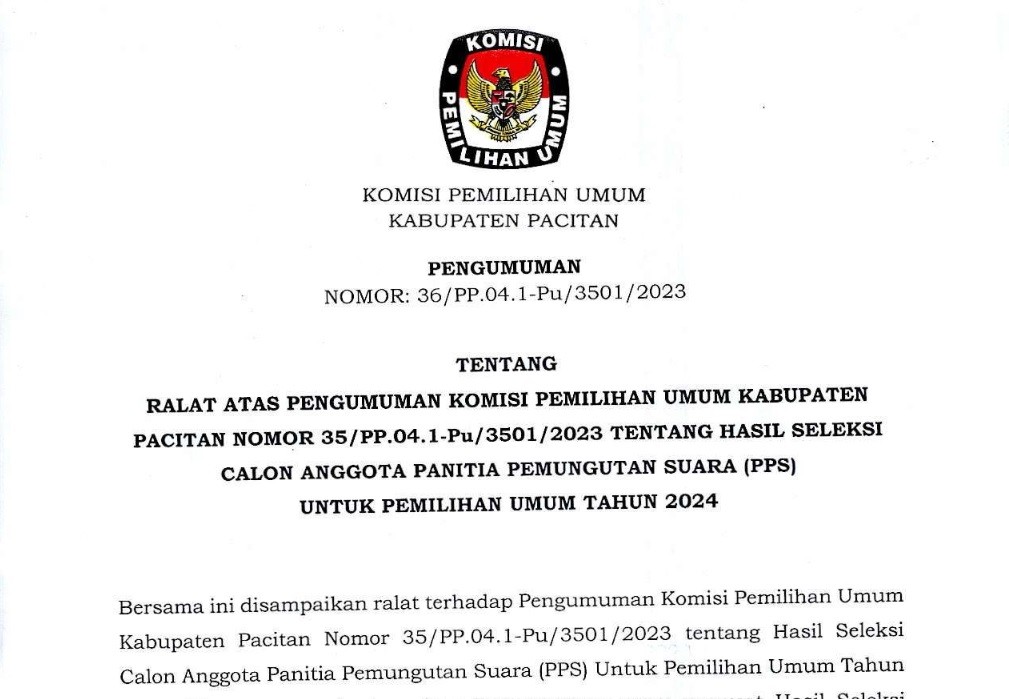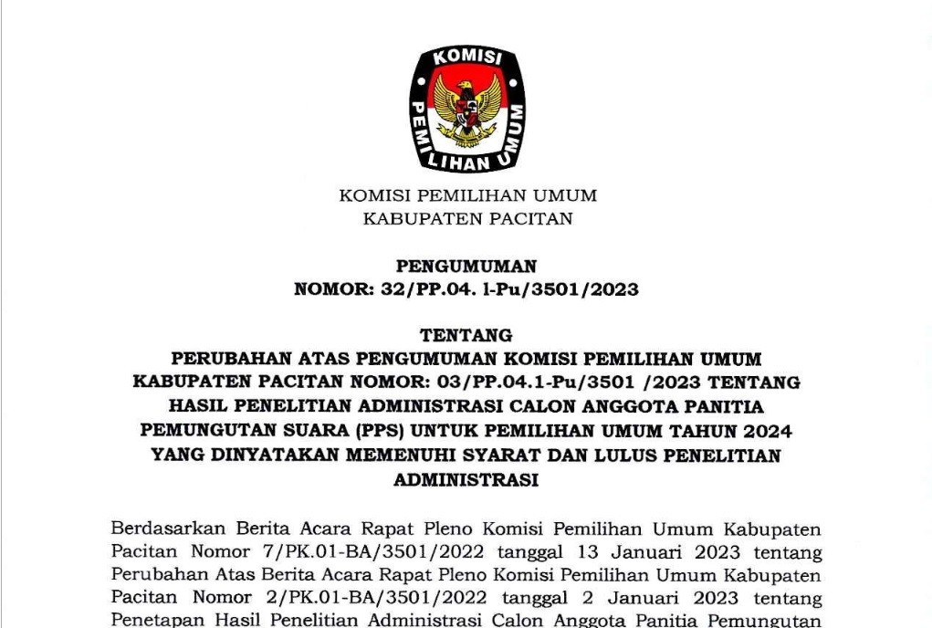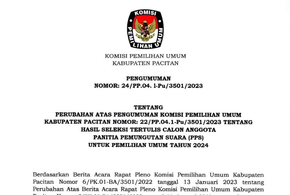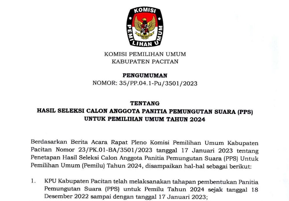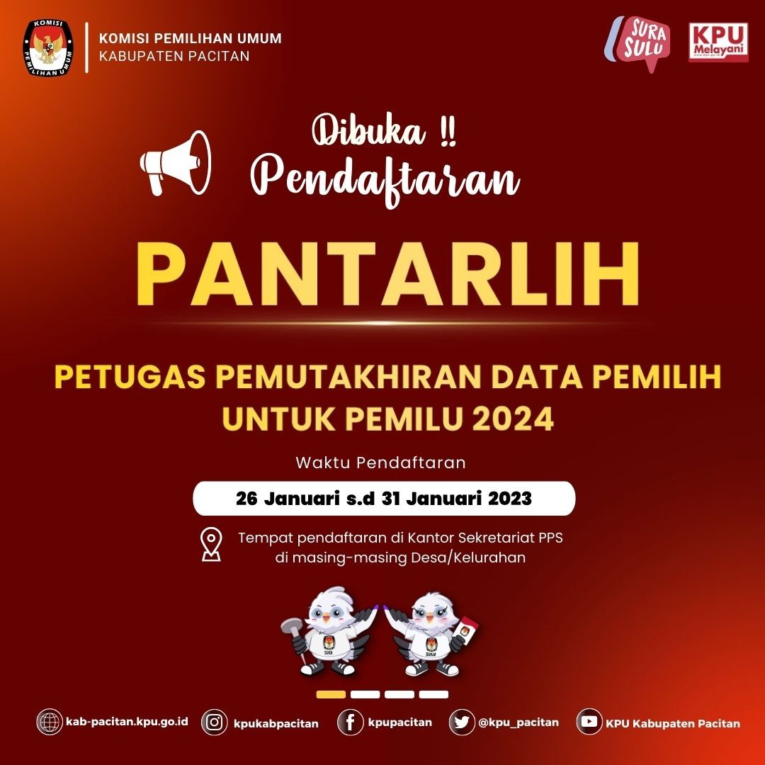 Pacitan, kab-pacitan.kpu.go.id - Ketua Komisi Pemilihan Umum (KPU) Kabupaten Pacitan, Sulis Styorini, mengajak seluruh Panitia Pemungutan Suara (PPS) langsung kerja usai dilantik. “Tahapan Pemilu 2024 sudah berjalan. Hari ini dilantik, besok langsung bekerja,” tandas Sulis Styorini, saat memberikan sambutan dalam acara pelantikan PPS Pemilu 2024 di Gedung Gasibu Pacitan, Selasa, 24 Januari 2023. Dikatakan, satu hari setelah PPS dilantik, langsung mempersiapkan pembentukan Petugas Pemutakhiran Data Pemilih (Pantarlih). Sebab, sesuai tahapan, pengumuman pembentukan Pantarlih dimulai 26 Januari 2023. ”Ada sebanyak 2.057 Pantarlih yang dibentuk untuk membantu PPS dalam melaksanakan pemutakhiran data,” jelas Ketua KPU Pacitan. Perlu diketahui, jumlah Pantarlih tersebut menyesuaikan jumlah TPS. Artinya, 1 orang Pantarlih pada tiap TPS. Pantarlih dapat berasal dari perangkat kelurahan/desa, rukun warga, rukun tetangga, dan/atau warga masyarakat. Seleksi penerimaan Pantarlih dilaksanakan secara terbuka dengan memperhatikan kompetensi, kapasitas, integritas, dan kemandirian calon Pantarlih. Adapun, kegiatan seleksi Pantarlih meliputi : 1. Penyampaian Pengumuman Pendaftaran Pantarlih selama 3 hari mulai 26 Januari 2023 s.d. 28 Januari 2023; 2. Penerimaan Pendaftaran Calon Pantarlih selama 6 hari mulai 26 Januari 2023 s.d. 31 Januari 2023; bertempat di Sekretariat PPS di masing masing Desa/Kelurahan; 3. Penelitian administrasi calon Pantarlih oleh PPS dilaksanakan selama 7 hari, dimulai satu hari setelah penerimaan pendaftaran, yaitu mulai 27 Januari 2023 s.d. 2 Februari 2023. 4. Pengumuman hasil seleksi calon Pantarlih selama 3 hari mulai 3 Februari 2023 s.d. 5 Februari 2023. 5. Penetapan nama hasil seleksi Pantarlih pada 5 Februari 2023; 6. Pelantikan Pantarlih secara serentak pada Senin, 6 Februari 2023 oleh Ketua PPS atas nama Ketua KPU Kabupaten Pacitan; Karena itu, PPS terlantik diharapkan segera melakukan langkah-langkah strategis. Diantaranya memilih Ketua PPS dan melakukan pembagian bidang tugas anggota PPS. Selain itu, segera berkoordinasi, silaturahmi kepada Kepala Desa/Lurah guna pembentukan Sekretaris dan Staff Sekretariat PPS. Berkoordinasi, silaturahmi kepada para Pemangku kepentingan di tingkat Desa/Lurah serta Mitra Kerja PPS untuk membangun konsolidasi kelembagaan yang kuat. (Tim Bakohumas KPU Pacitan/wit)