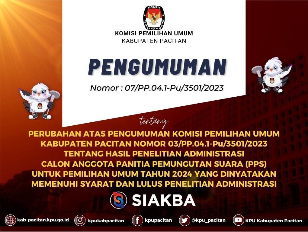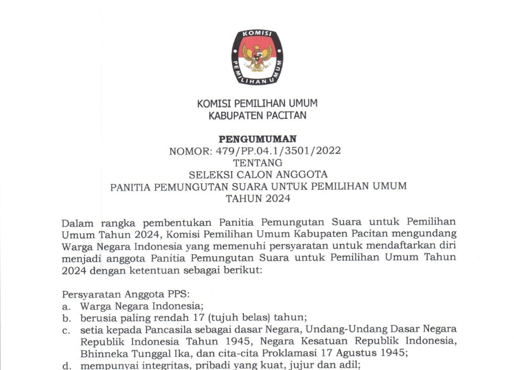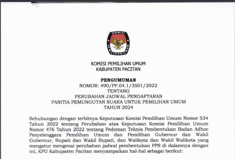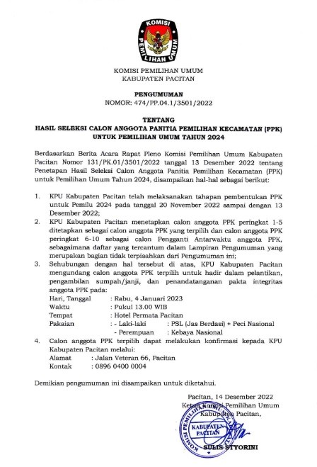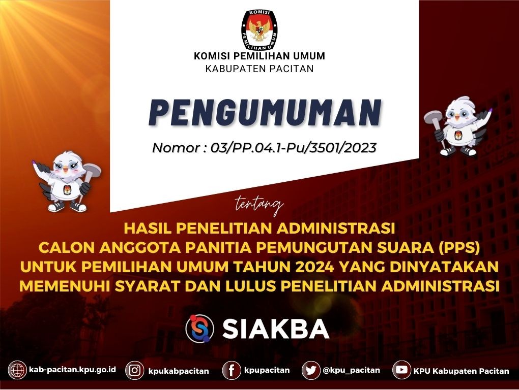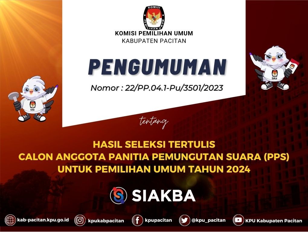 Berdasarkan Berita Acara Rapat Pleno Komisi Pemilihan Umum Kabupaten Pacitan Nomor 5/PK.01-BA/3501/2023 tanggal 11 Januari 2023 tentang Penetapan Hasil Seleksi Tertulis Calon Anggota Panitia Pemungutan Suara (PPS) Untuk Pemilihan Umum (Pemilu) Tahun 2024, KPU Kabupaten Pacitan mengumumkan Hasil Seleksi Tertulis Calon Anggota Panitia Pemungutan Suara (PPS) Untuk Pemilihan Umum (Pemilu) Tahun 2024.