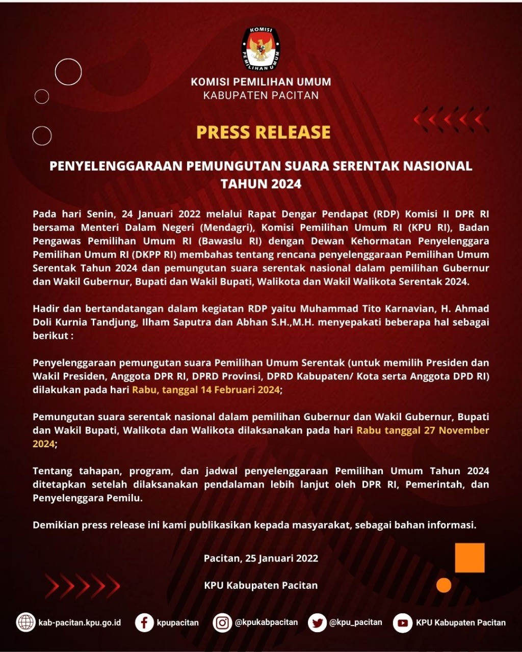 Pada hari Senin, 24 Januari 2022 melalui Rapat Dengar Pendapat (RDP) Komisi II DPR RI bersama Menteri Dalam Negeri (Mendagri), Komisi Pemilihan Umum RI (KPU RI), Badan Pengawas Pemilihan Umum RI (Bawaslu RI) dengan Dewan Kehormatan Penyelenggara Pemilihan Umum RI (DKPP RI) membahas tentang rencana penyelenggaraan Pemilihan Umum Serentak Tahun 2024 dan pemungutan suara serentak nasional dalam pemilihan Gubernur dan Wakil Gubernur, Bupati dan Wakil Bupati, Walikota dan Wakil Walikota Serentak 2024.