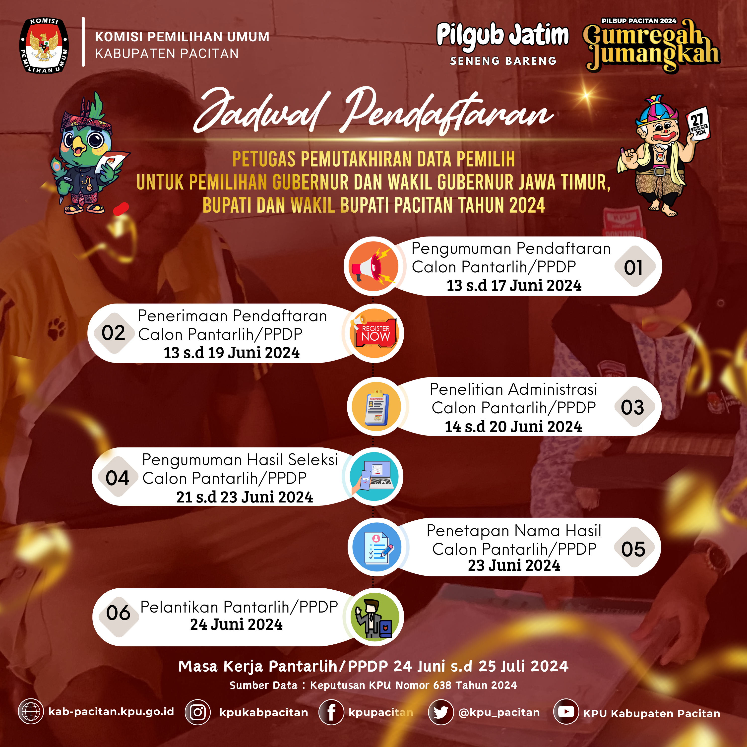 Ikuti terus informasinya di media sosial KPU Pacitan dan informasi di tingkat kecamatan maupun tingkat desa/kelurahan terdekat yaa