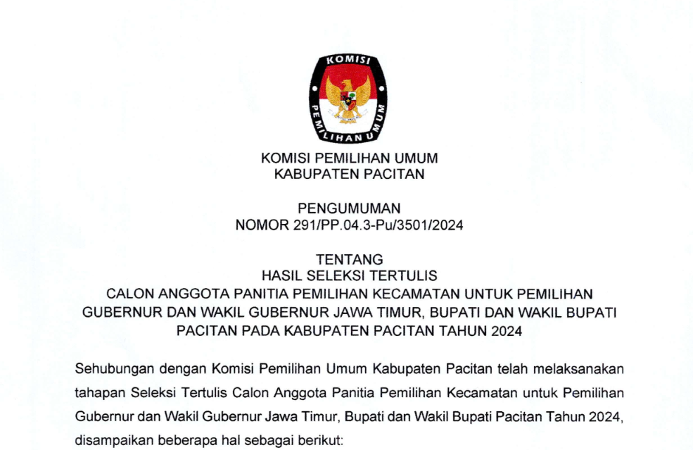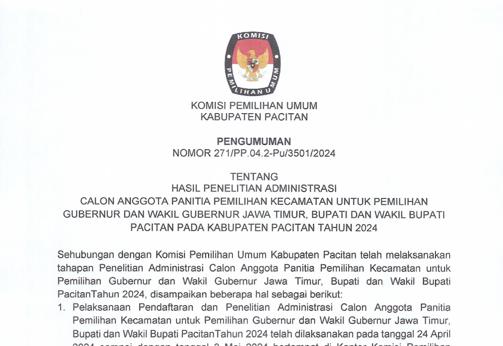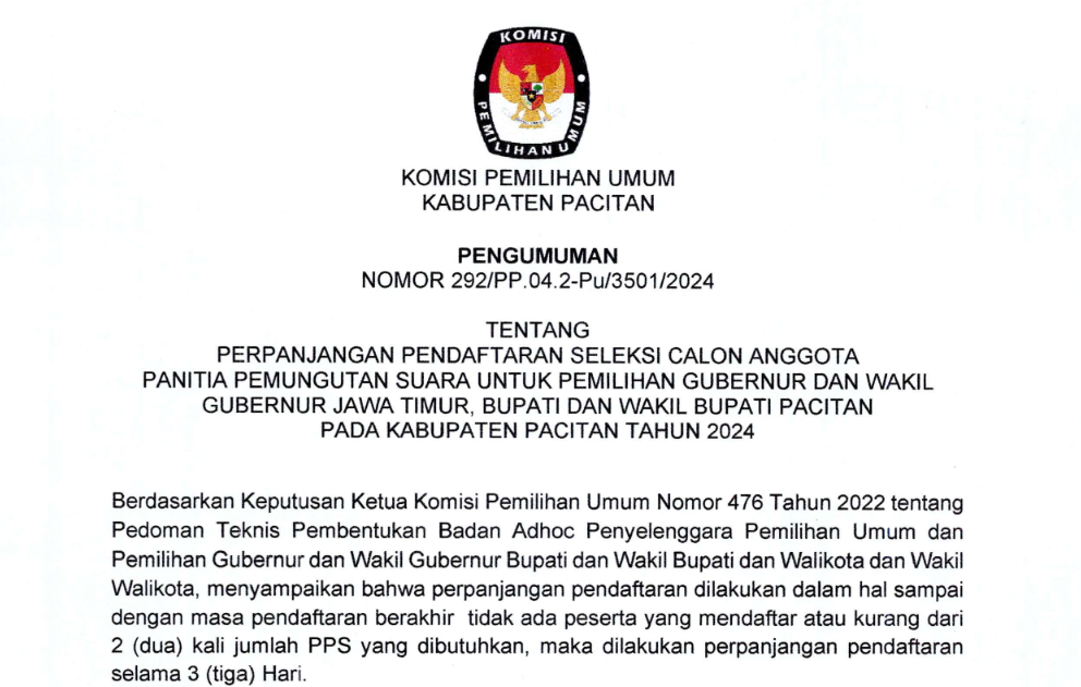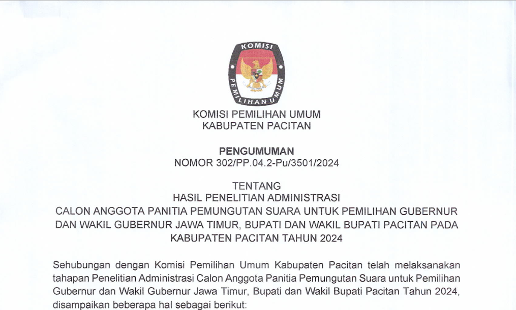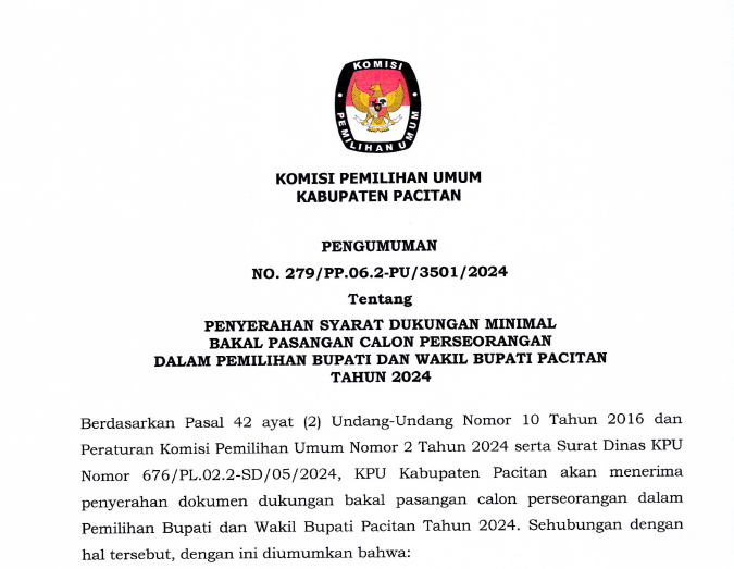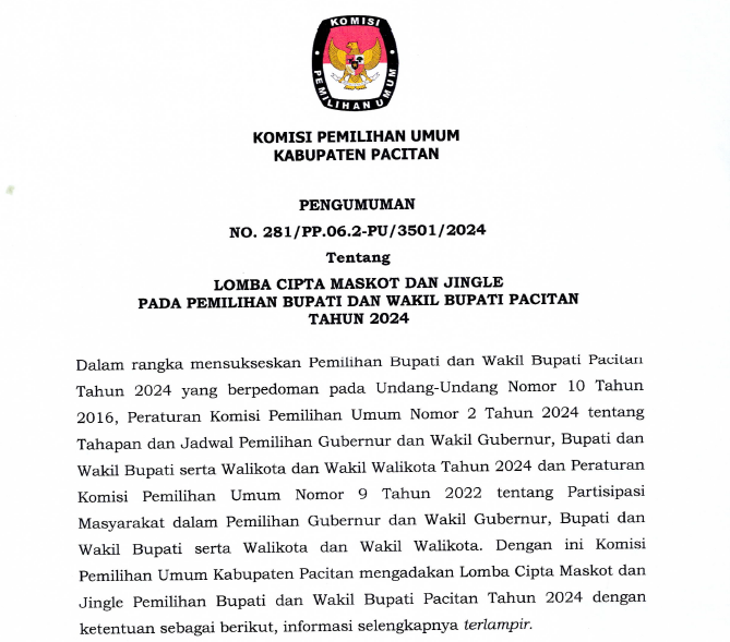 Dalam rangka menyukseskan Pemilihan Bupati dan Wakil Bupati Pacitan Tahun 2024 yang berpedoman pada Undang-Undang Nomor 10 Tahun 2016, Peraturan Komisi Pemilihan Umum Nomor 2 Tahun 2024 tentang Tahapan dan Jadwal Pemilihan Gubernur dan Wakil Gubernur, Bupati dan Wakil Bupati serta Walikota dan Wakil Walikota Tahun 2024 dan Peraturan Komisi Pemilihan Umum Nomor 9 Tahun 2022 tentang Partisipasi Masyarakat dalam Pemilihan Gubernur dan Wakil Gubernur, Bupati dan Wakil Bupati serta Walikota dan Wakil Walikota. Dengan ini Komisi Pemilihan Umum Kabupaten Pacitan mengadakan Lomba Cipta Maskot dan Jingle Pemilihan Bupati dan Wakil Bupati Pacitan Tahun 2024 dengan ketentuan sebagai berikut, informasi selengkapnya :